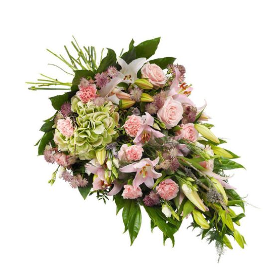 Tűzött kegyeleti dísz fehér, rózsaszín színvilágban.