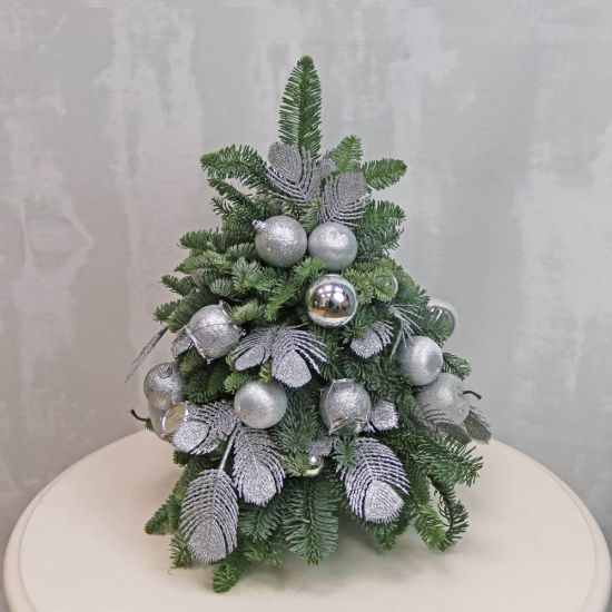 Mini karácsonyfa fenyőágakból ezüst ünnepi díszítéssel.