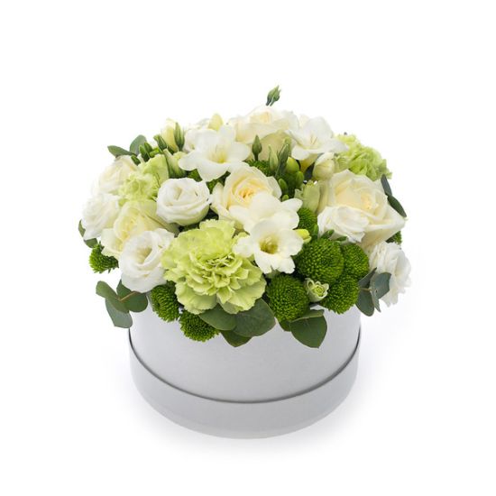 - Összeállítás: Kiváló minőségű, friss, fehér és zöld árnyalatú virágok.