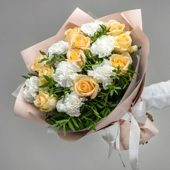 Virágcsokrunk a múlt szép pillanatait idézi meg, miközben a szeretet és a törődés meleg érzésével ajándékozza meg az ajándékozottat. A csokor lágy, pasztell árnyalatú és fehér színű virágok harmonikus összeállítása, amely finoman ötvözi a romantikát és az időtlen eleganciát.